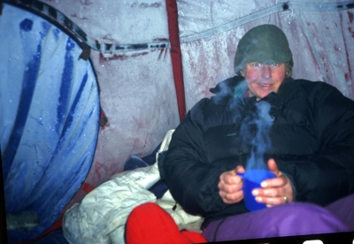After a week in the cold, our tent was beginning to resemble the inside of a snow cave; the walls were white over with hoarfrost and all our clothes seemed to be iced up. That night the thermometer hit minus 24, the coldest temperature I had ever experienced. I sat and marveled at Fiona pulling apart the frozen fabric of her sleeping bag preparing for bed. Conditions were not comfortable and I felt proud of her ability to deal with it and say nothing.